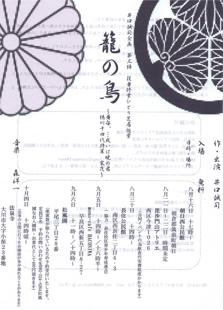 明日は当初の予定を大幅に変更しまして、大川市の法泉寺へ『籠の鳥 ~黄昏、・・・或いは暁の君 徳川十四代将軍 家茂~』という、井口誠司さんのひとり芝居を観に行きます。